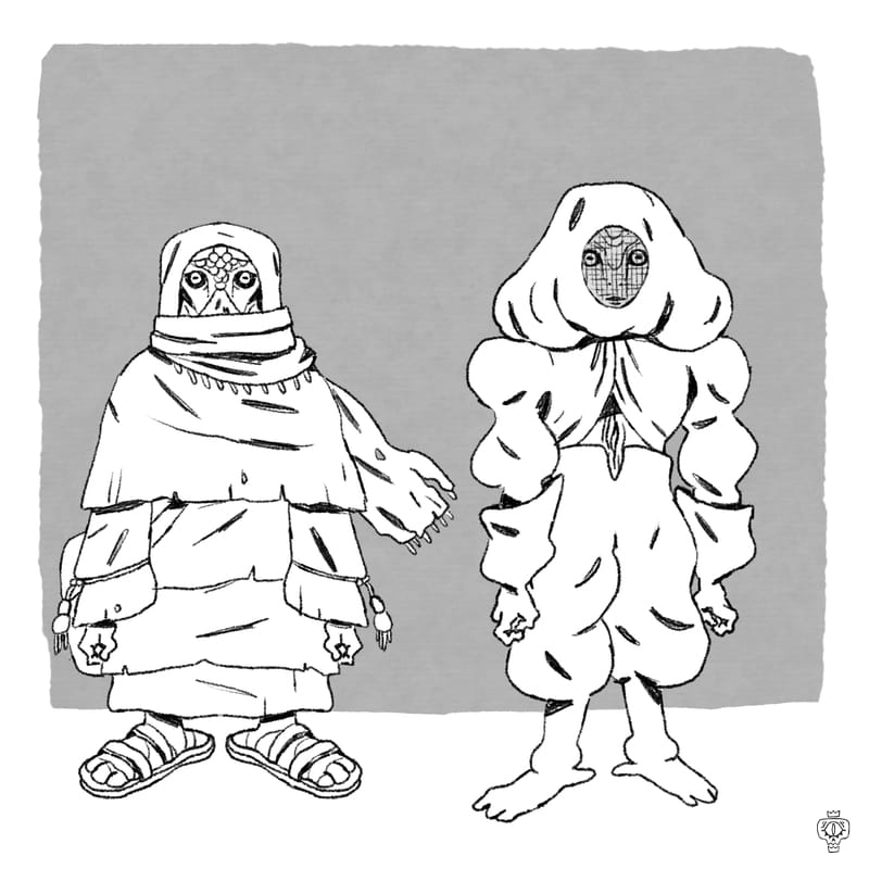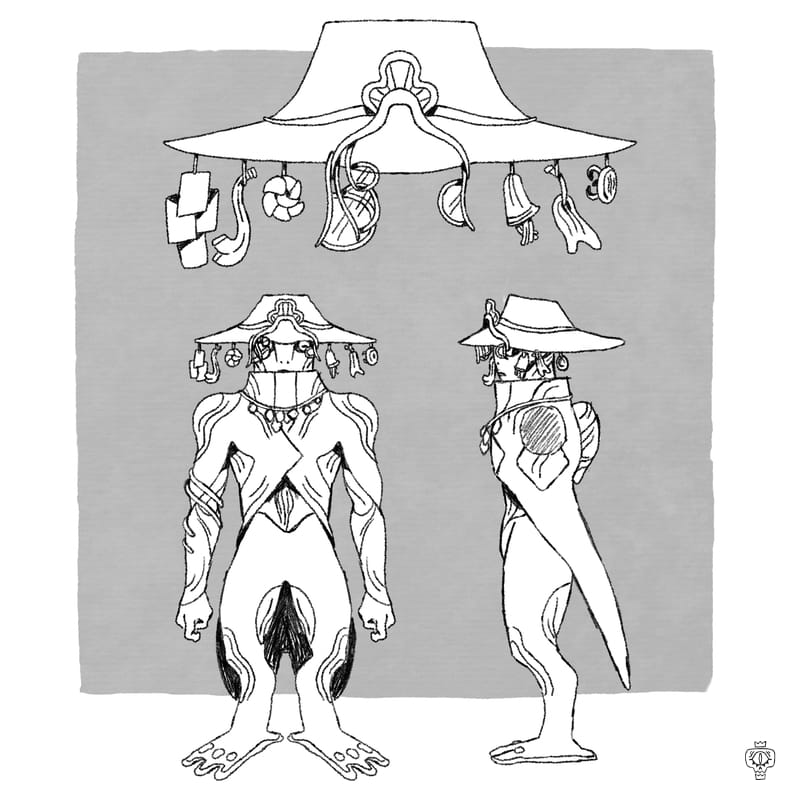 A key part of my work on “The Book of Holes” is understanding and translating the visual language of Shokrafian art into a cohesive design structure. Often I work with very stylized and of course damaged artworks as well as the original text of the Book and other generously provided material. While my work of course will always be tinted through my own human sensibilities, I try to create an accurate and thorough visual library of the Proto-Shokrafians, as well as their culture, their clothing, their environments.
