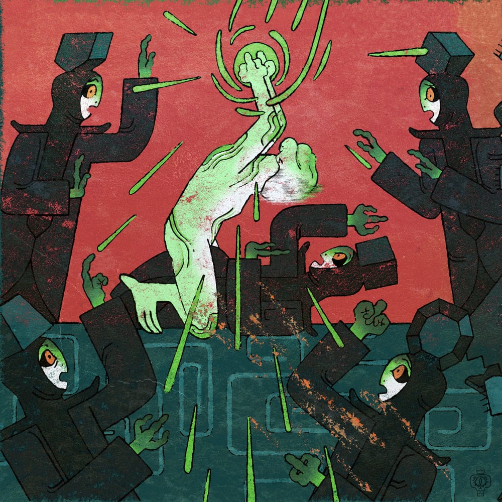“The Tablets of Holath” chronicle a key part of one of “The Book of Holes” most important figures, the prophet Goareth. These illustrations have originally been carved and painted on six-sided stone dice, each illustration connecting to the other five. They have been digitized, painstakingly restored and brought back to life to allow humans to experience Goareth’s journey of tribulations, betrayals and divine epiphanies.